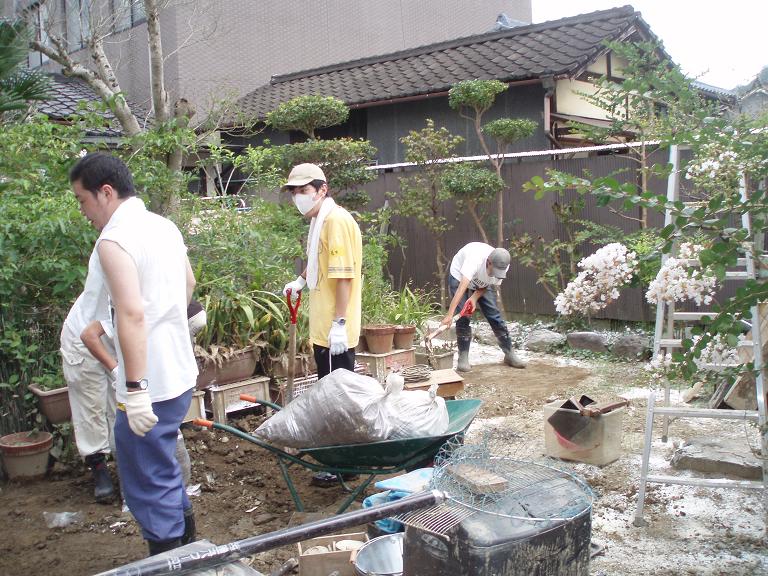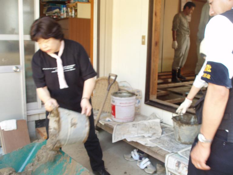 園ブロック長様はその後、ボランティア隊と合流されました。 その場所は、佐用町内の工場と住居が隣接しているところで、床上30cmぐらいまで水が上がってきたとの説明でした。 水が引いた後には、泥がいたるところ一面に約10cmの厚さで残っていました。 まず床の下の泥をバケツリレーにより、外に運び出し、続いて庭の泥も運び出しました。 途中、腐ったどぶ川のようなにおいが泥から常に発生していて、気分が悪くなる人も出ましたが、約6時間の作業を無事終えました。