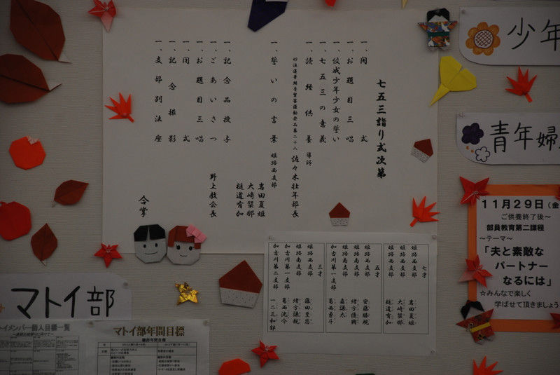 平成25年・七五三詣り 2013年11月17日 過去の記事 今年も、11月17日(日)姫路教会に於きまして七五三詣りが催され、可愛い十名の豆菩薩が一人一人、野上教会長より記念品を頂きました。式典後、恒例の写真撮影がありましたが、各親御さんがシャッターチャンスの時、子供さんを追っかけまわっている姿が微笑ましくもあり、癒されました。