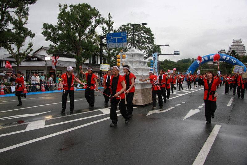 【 本番スタート 】 冒頭の写真でお分かりの様に、プラカードは「万灯行進」になっておりますが、雨の中でしたので「萬燈」の代わりに「姫路城の山車」を先頭に行進しました。