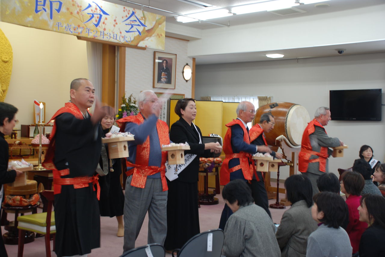 まき手は、河南教会長を中心に、書寫山圓教寺教化部長・中安剛圓様、地元自治会長様、老人会長様、そして水口元教会長様のご来賓の皆様と、今年[還暦・厄年を迎えられた方々]が赤いハッピを着、大きな声で「鬼は外・福は内」と威勢よく豆をまかれました。
