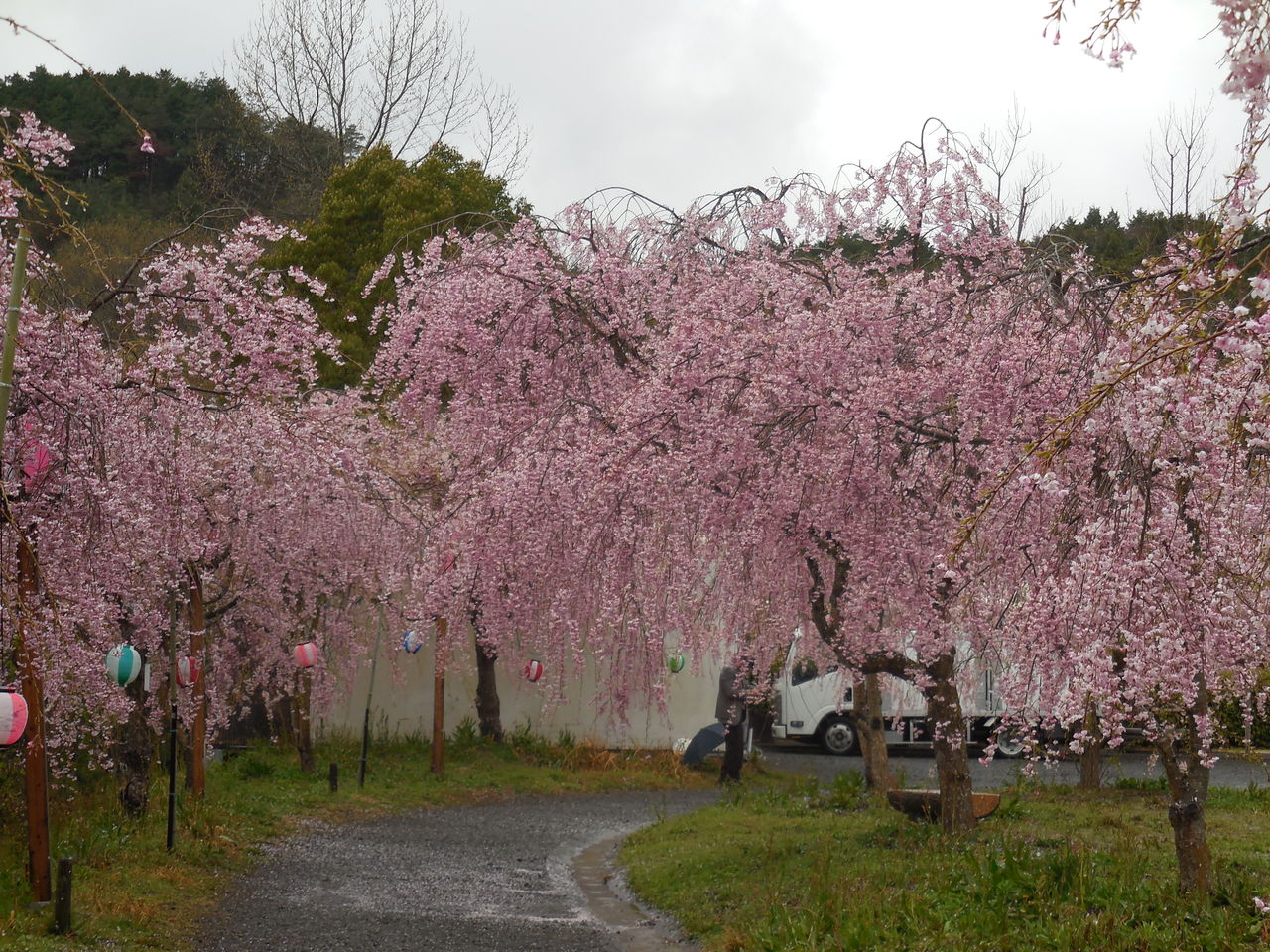 「たけべの森」では小雨の降る中、しだれ桜の並木の花や、つつじの花が咲き誇る高原を散策しました。緑一杯の中、心が洗われ癒されました。