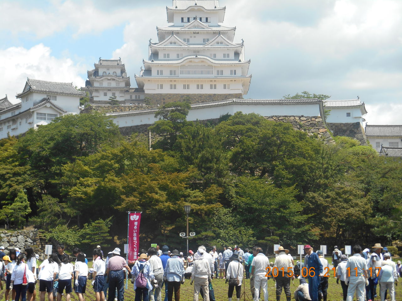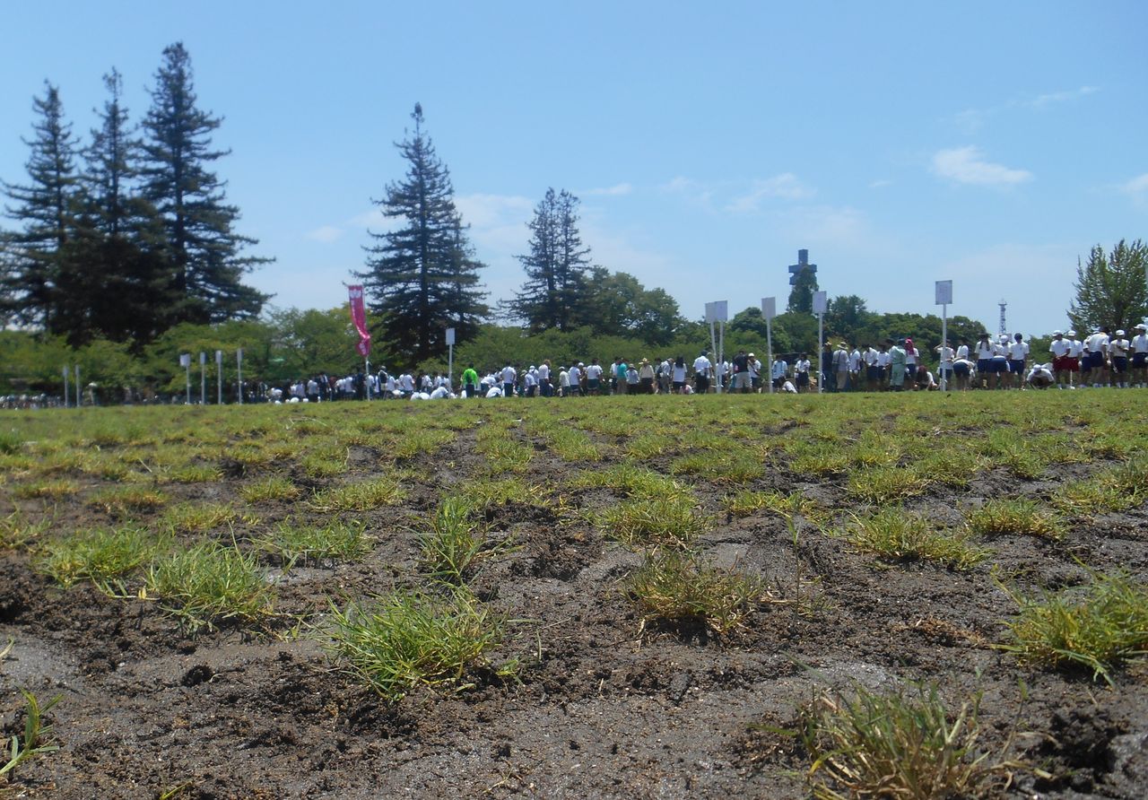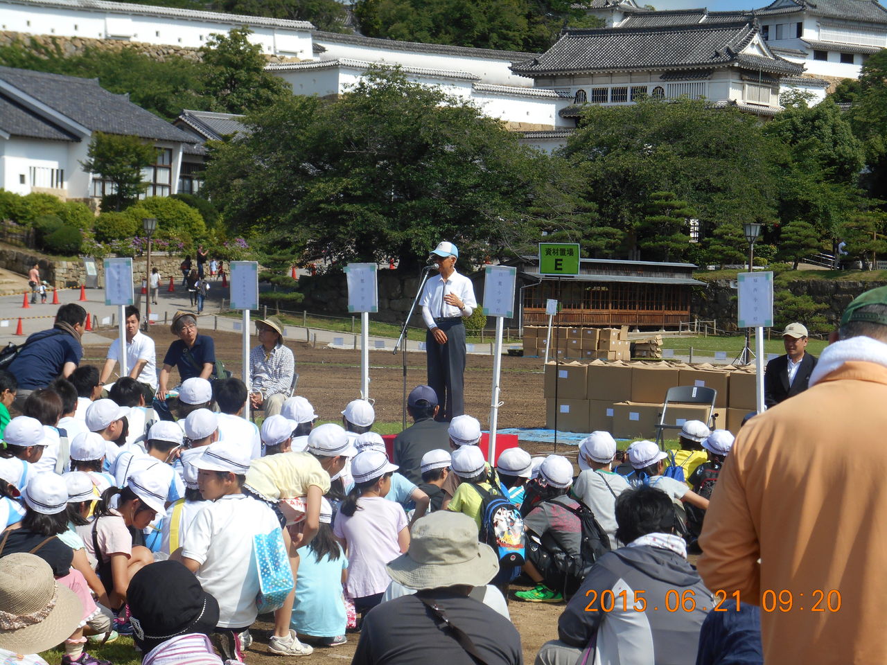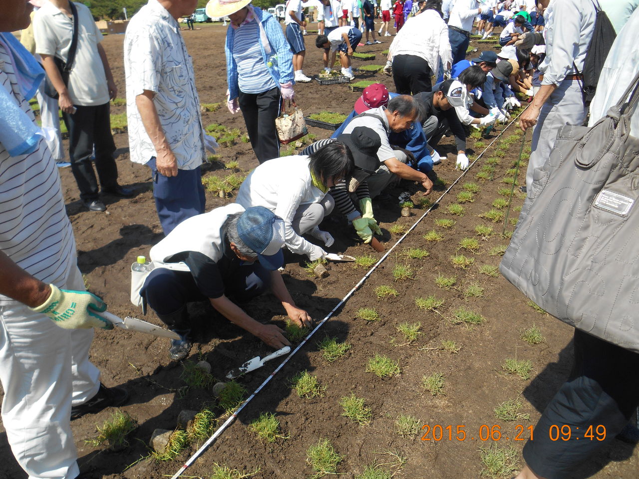 それに伴い、天守閣を正面に仰ぐ「三の丸広場」をもっと緑でいっぱいにしようと、姫路愛城会が市内の小・中学校・高校生、そして各企業・団体に呼びかけ、6月21日(日) 1,200名の参加を得て、三の丸広場北半分、約40アールの土地に『芝生の植栽』を行いました。