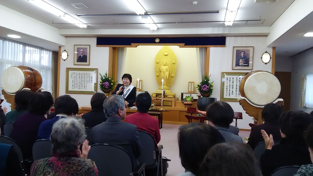 今月の釈迦牟尼仏ご命日の式典は、清水総務部長さんのお導師のもと読経供養から始まり、姫路東支部Oさん・姫路北支部Aさんお二人による功徳の発表がありました。
